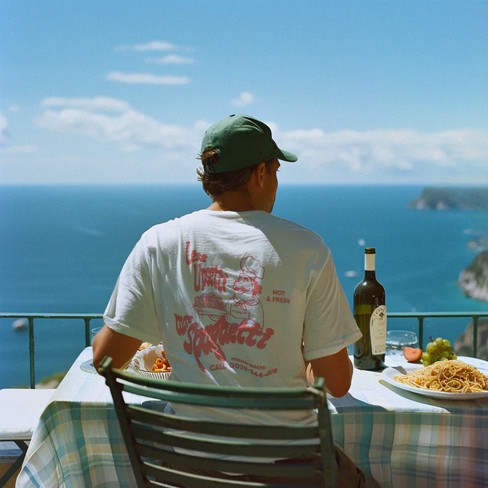 Suuri ‘More Spaghetti – Less Upsetti’ printti selässä