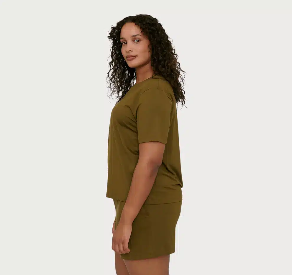 Ekologinen, silkinpehmeä Organic Basics t-paita. Pyöreä pääntie.