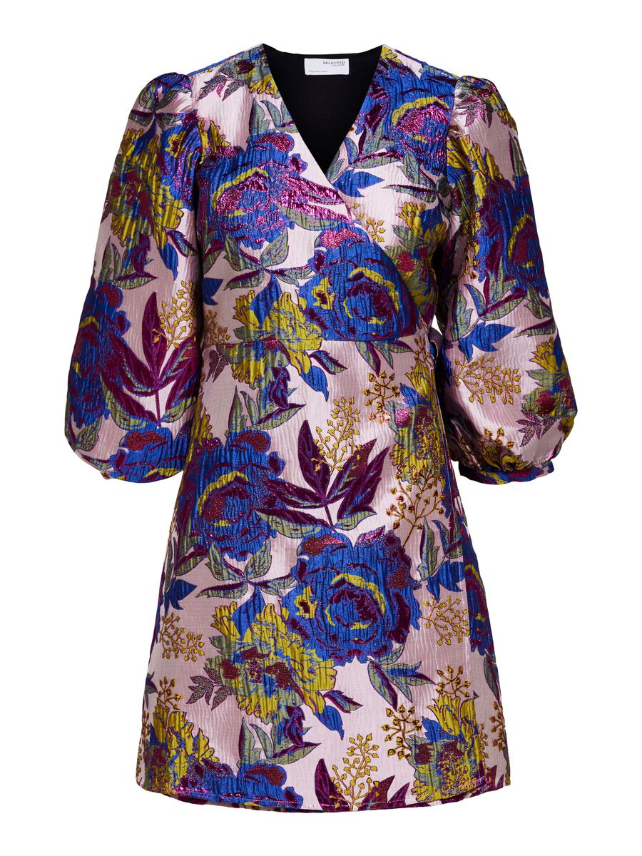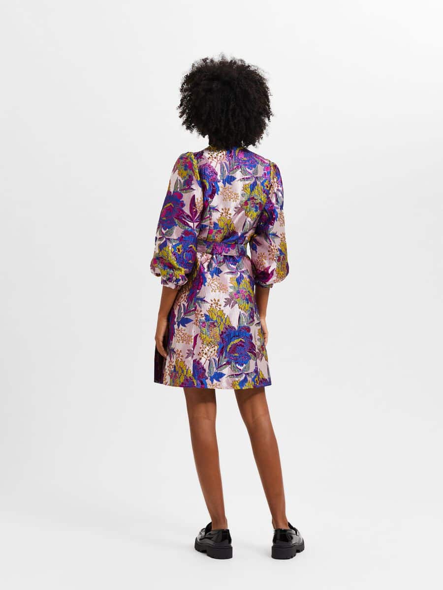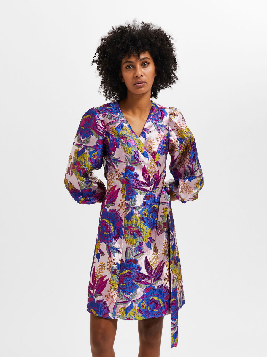 Naisten mekko. Hohtavapintainen Selected Femme jacquard-kietaisumekko.