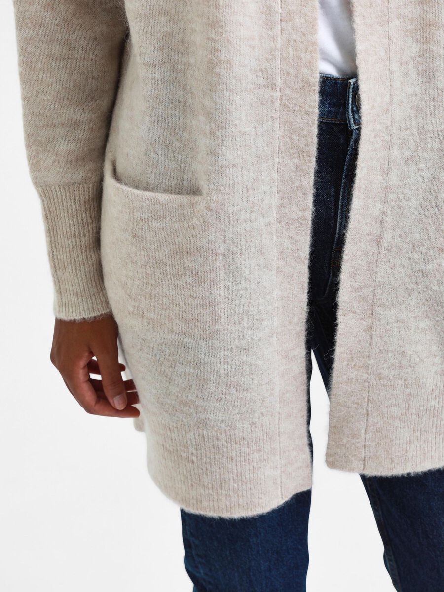 Selected Femme pitkä neuletakki on ylellisen pehmeää villasekoitetta. Edestä avoin malli jossa sivutaskut.