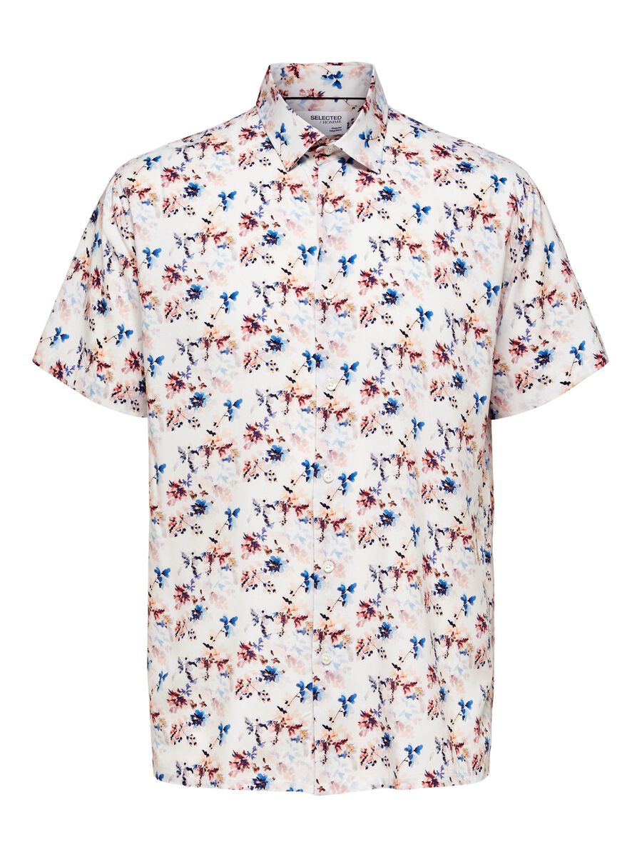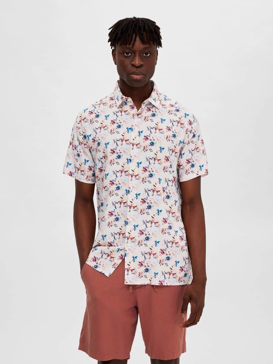 Lyhythihainen Selected Homme kuosipaita ekologista LENZING™ ECOVERO™ viskoosia. Eläväinen kukkakuosi.
