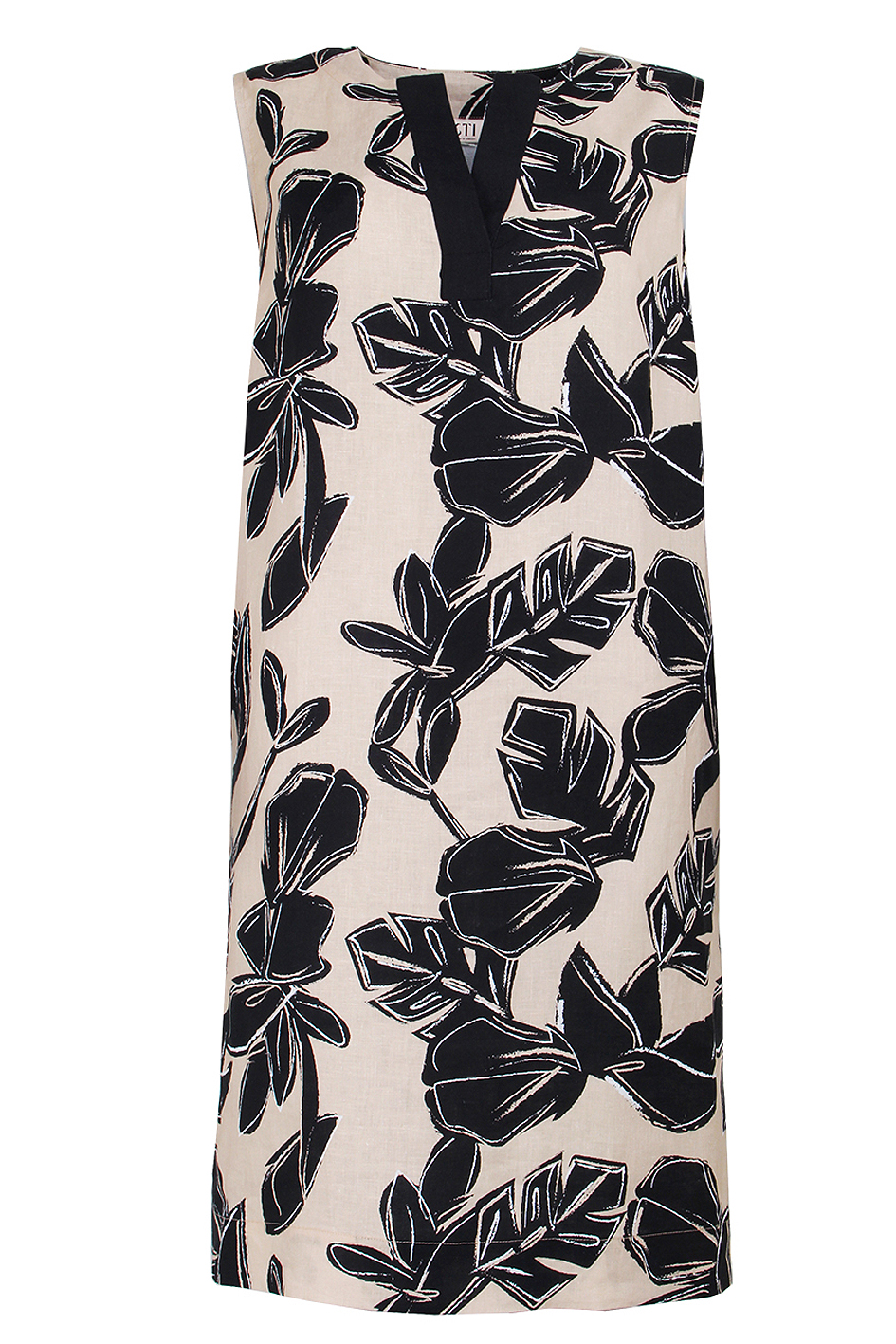 Suomessa suunniteltu STI kuosillinen pellavamekko.