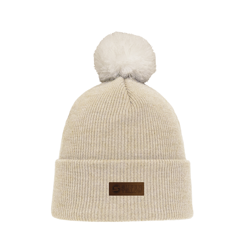 Naisten pipo. Suomalainen Superyellow tupsupipo on valmistettu merinovillasta. Pipon käänteessä tekonahkainen logomerkki.