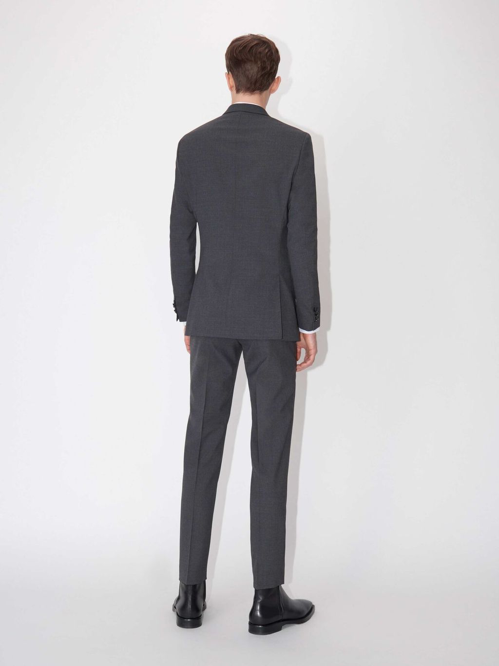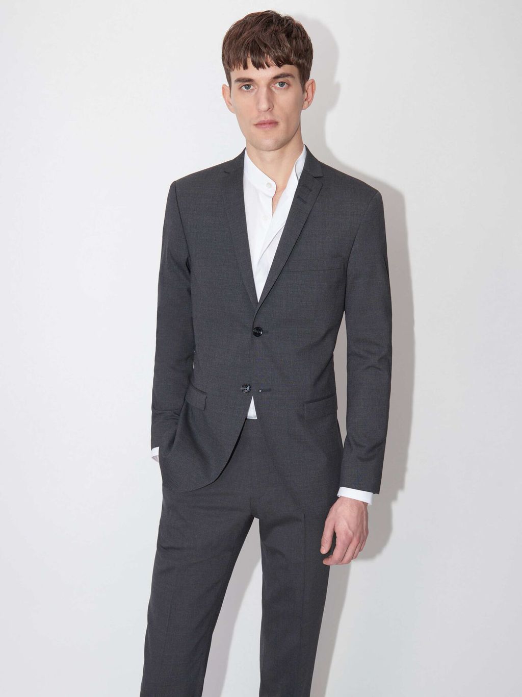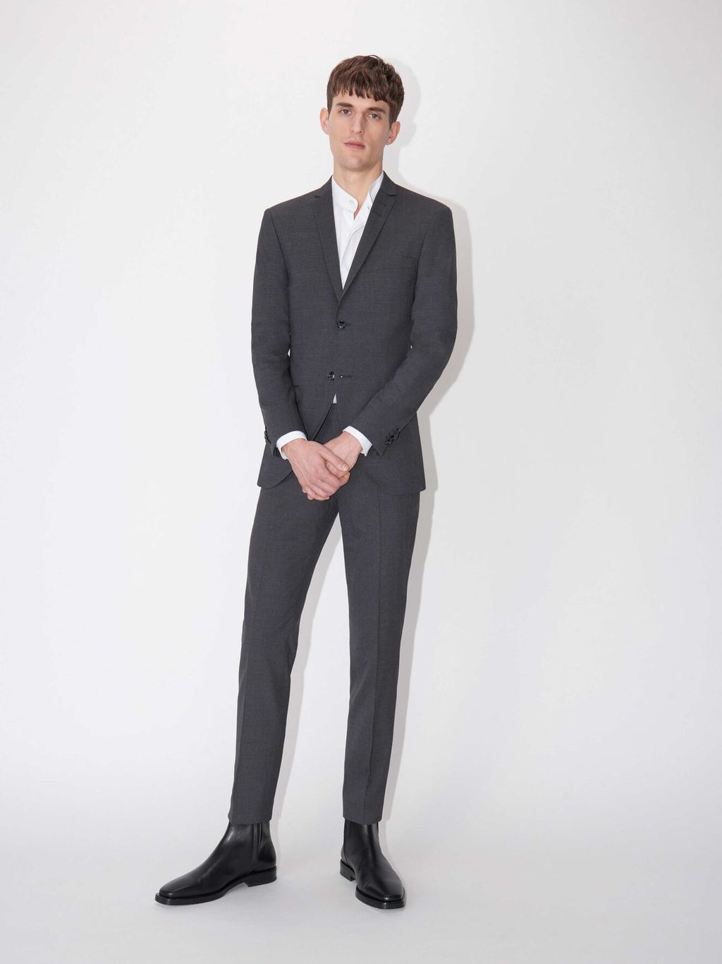 Miesten bleiseri. Tummanharmaa kapeamitoituksinen hyvin istuva Tiger Of Sweden Jil bleiseri on laadukasta villa/stretch laatua. Takki kiinnittyy kahdella napilla ja siinä on kaksi läpällistä taskua edessä. Takana halkiot. Vuoritettu.