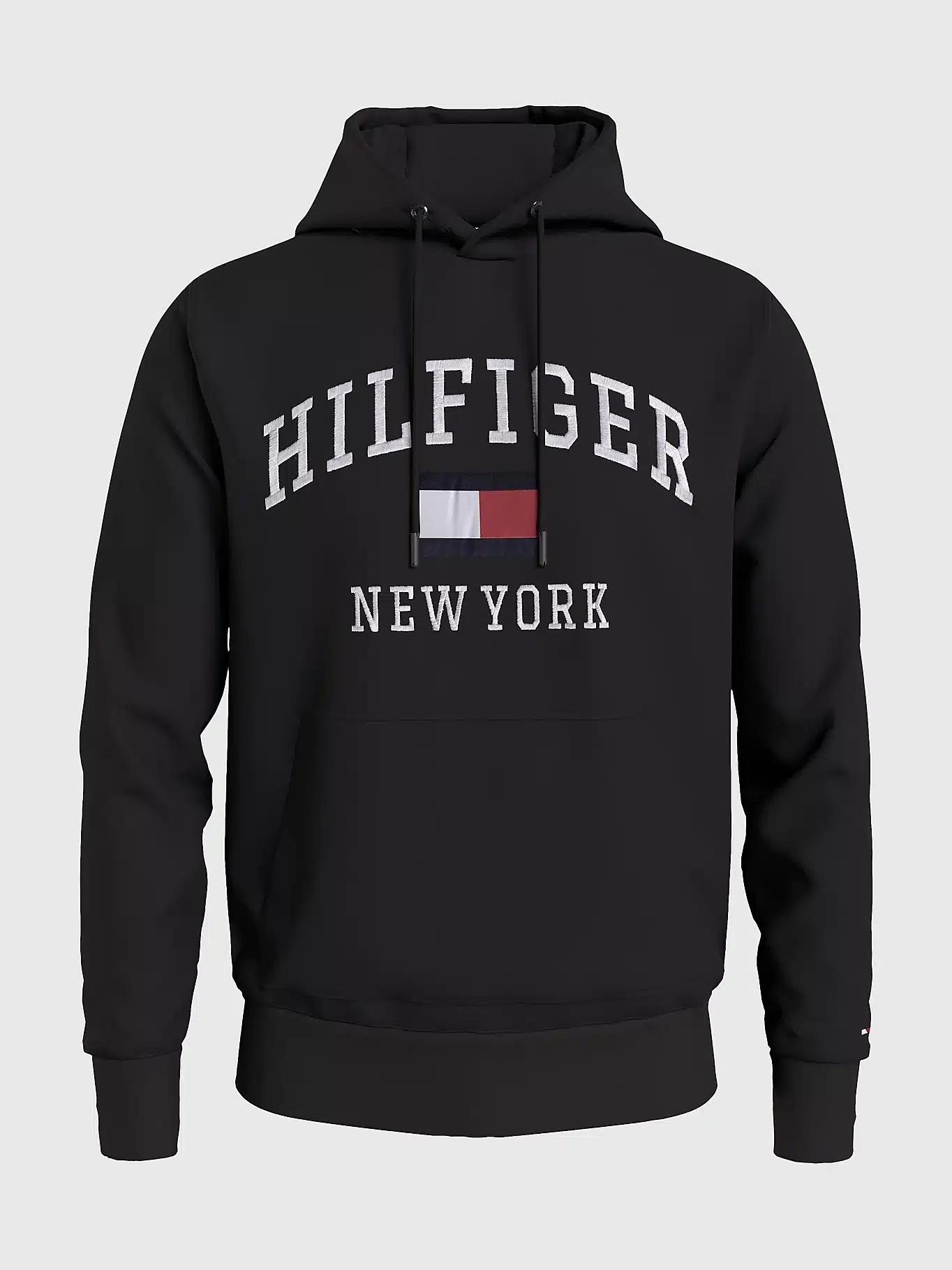 Miesten huppari. Musta Tommy Hilfiger logohuppari. Hupparin rinnassa suurikokoinen logoprintti.